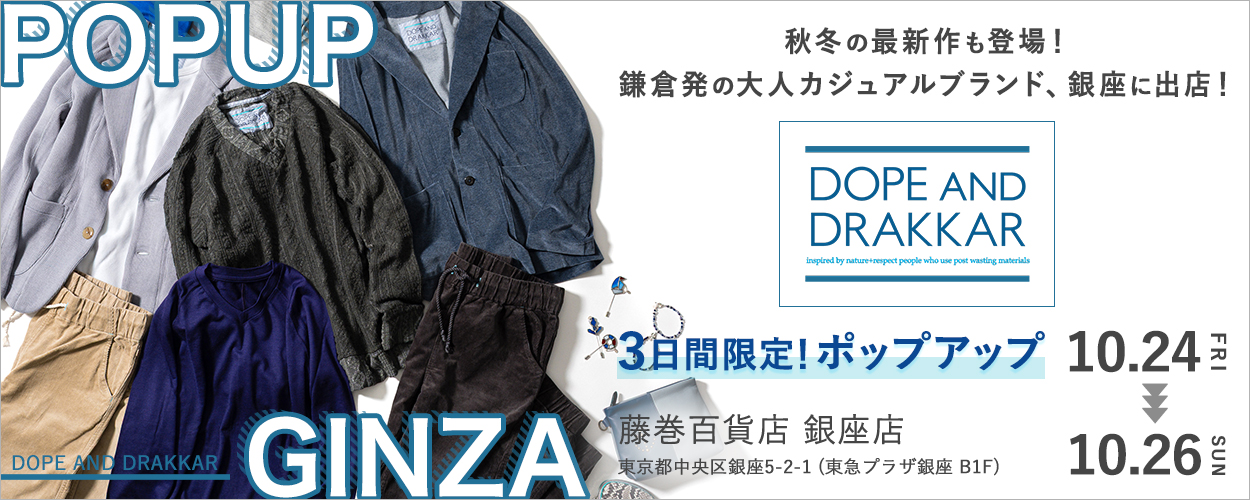 ◆大人気カジュアルブランド「DOPE&DRAKKAR」が銀座店に!◆新作含む秋冬のラインナップが豊富に揃います♪さらにイベント期間中は、デザインから接客まですべてを手掛ける中村3姉弟が店頭に立ちます!ぜひお三方と相談しながら気になるウェアを選んでみてください。また鎌倉のステンドグラス作家とコラボした「ピンブローチ」をイベントで先行販売!