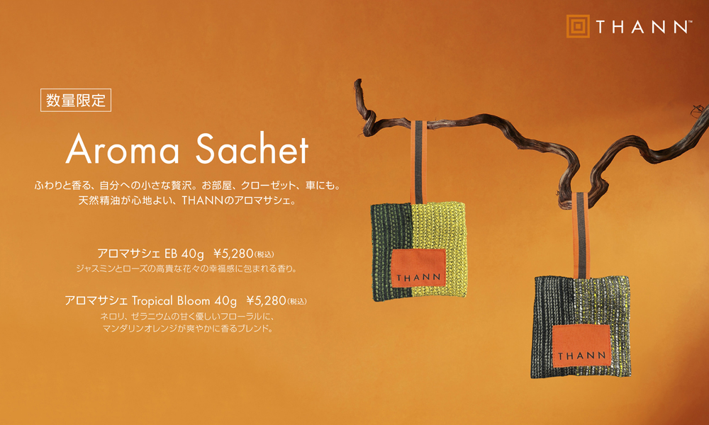 NEW 更新日:2025.10.31 THANN 03-6264-5205 数量限定 Aroma Sachet 実施日時 2025/10/31(金)~ 数量限定 Aroma Sachet 2025.10.31(Fri)発売! ふわりと香るご自身への小さな贅沢 お部屋やクローゼット 車にも 天然精油が心地よいTHANNのアロマサシェ アロマサシェEB40g ¥5,280(税込) ジャスミンとローズの高貴な花々の至福感に包まれる香り アロマサシェTB40g ¥5,280(税込) ネロリ・ゼラニウムの甘く優しいフローラルに マンダリンオレンジが爽やかに香るブレンド ぜひ店頭で香りをお試しください ご来店を心よりお待ちしております 公式HP X インスタ X この店舗のショップニュース Monthly Present
