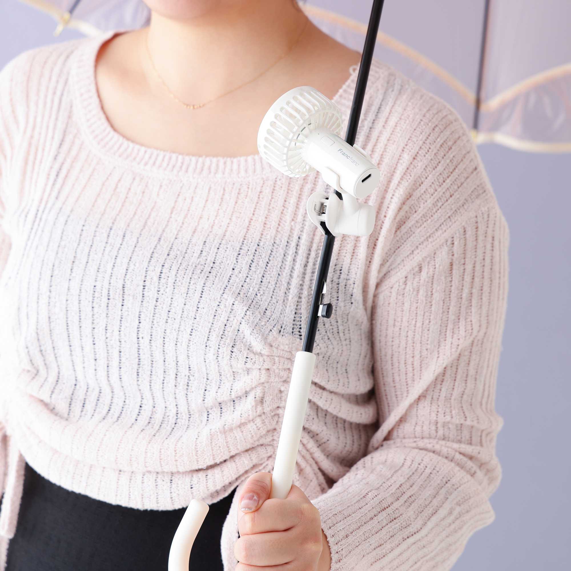 付属のクリップで日傘やバッグなど、さまざまな場所に取り付けたり、付属のネックストラップをつけて首から提げるとハンズフリーで使うことができます♪
