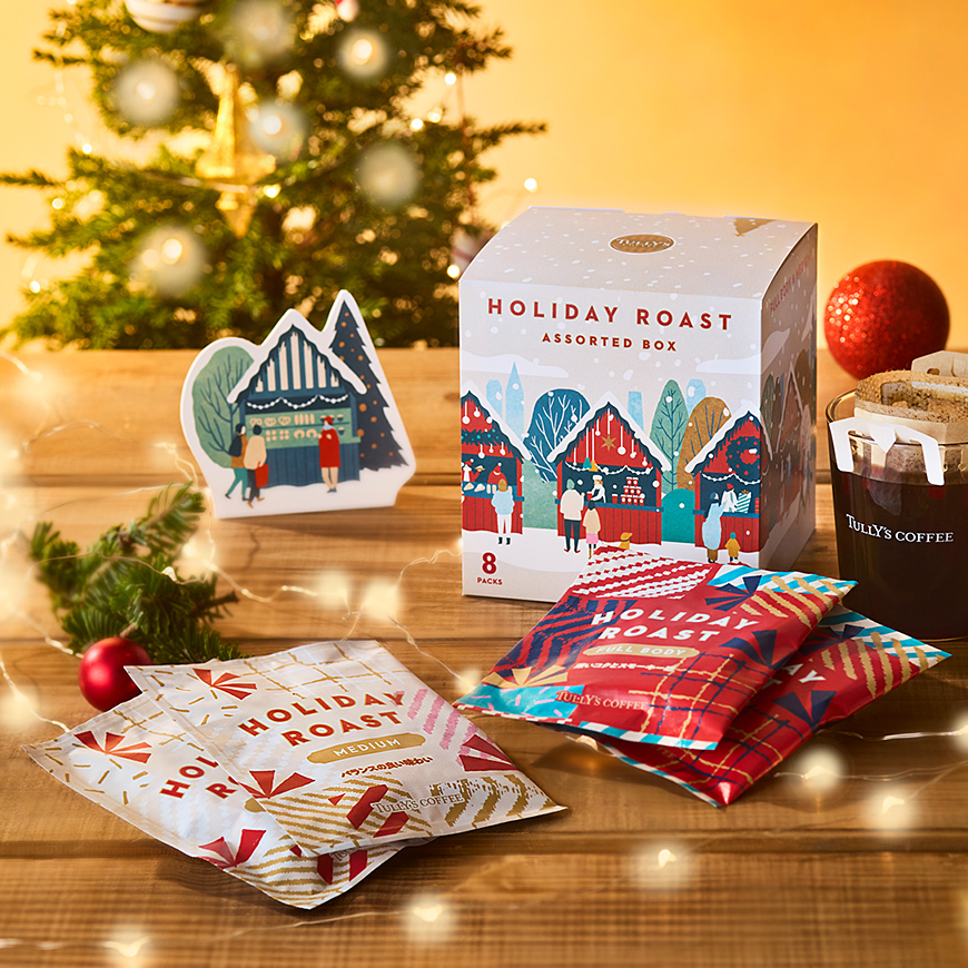 タリーズホリデーローストのフルボディとミディアムの味わいを、お湯を注ぐだけで簡単に抽出できるシングルサーブでもお楽しみいただけます。キューブ型のBOXはそのままギフトにもおすすめ。