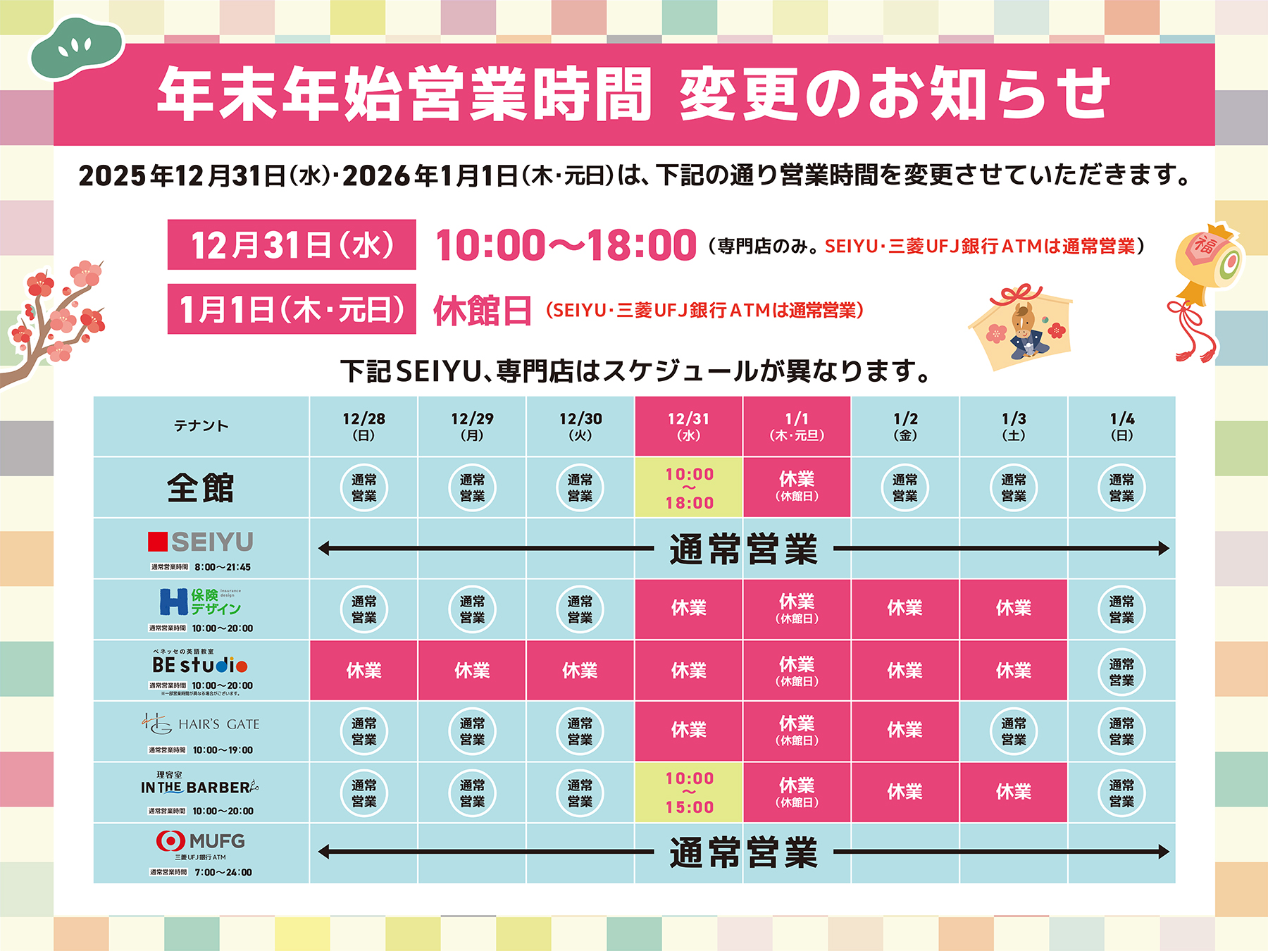 全館(専門店):12/31 10:00~18:00 ・ 1/1 休業