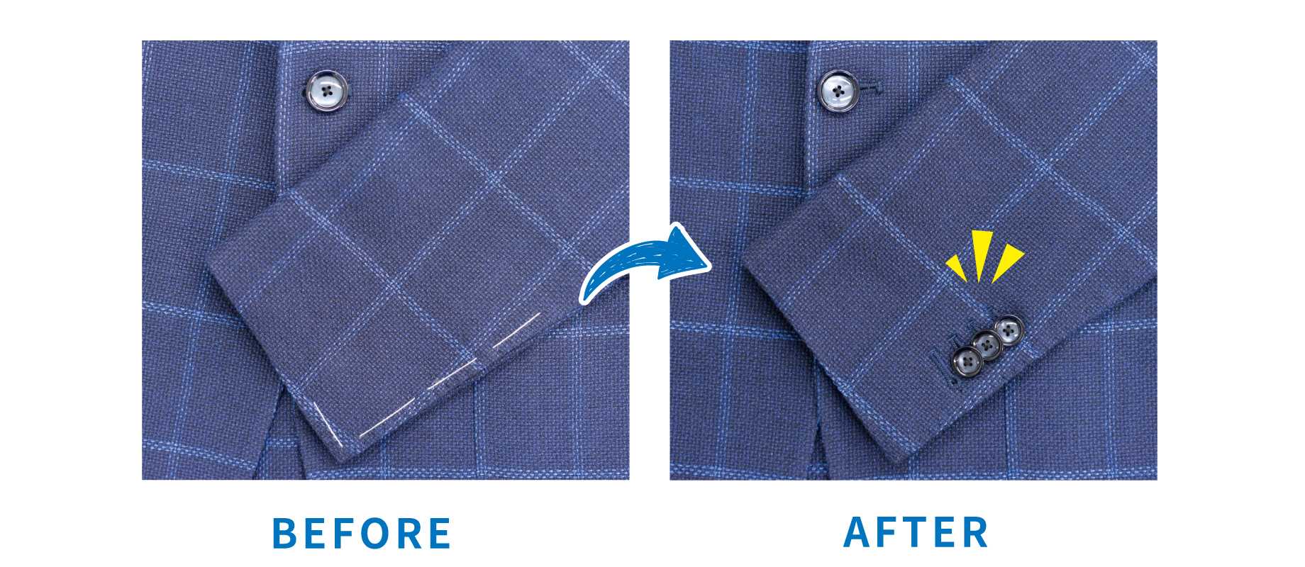 袖口にあるデザインもほとんどが元通りにお直し可能です。袖口にボタンホールがあるジャケットは袖口でお直しが出来ないため、袖山(肩)で丈を調整いたします。