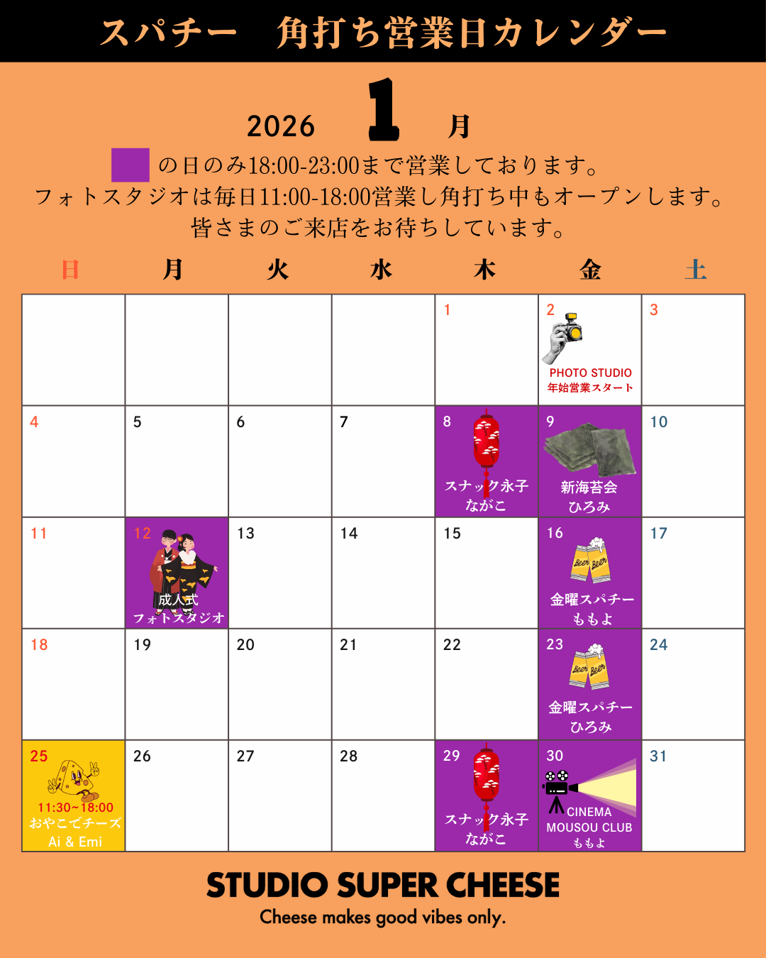カレンダー、紫のところが1月の18:00~23:00角打ち営業の日程です。