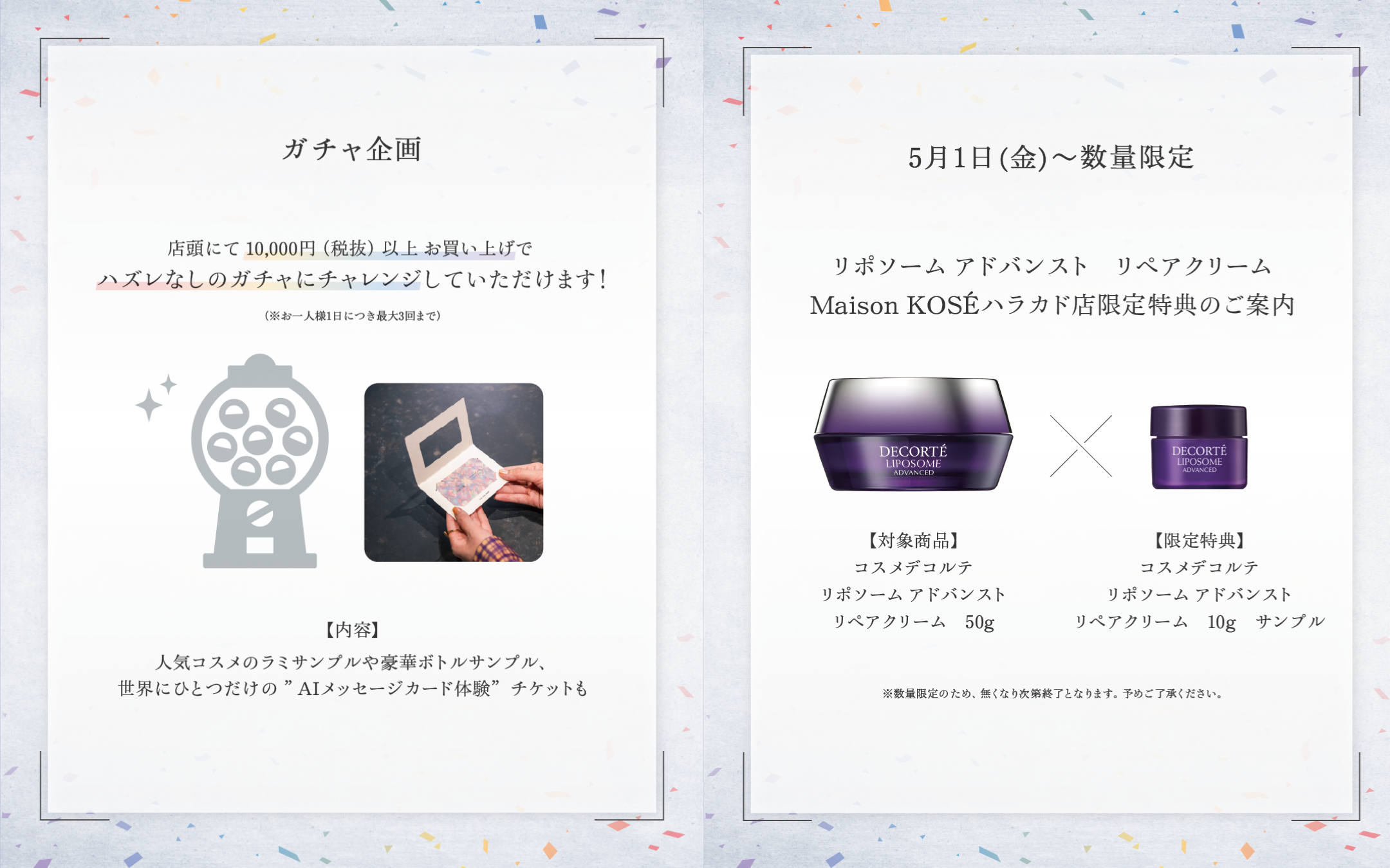 NEW 更新日:2026.04.30 Maison KOSÉ ハラカド Special Present Campaign 実施日時 5月1日(金)~6月30日(火)20:00 Maison KOSÉハラカドでは、日頃のご愛顧に感謝し、期間限定で特別なキャンペーンをご用意しました。 コスメガチャやハラカド店限定のコスメデコルテ購入特典をご用意してお待ちしております。 ▼詳細はこちらをご確認ください▼ 皆様のご来店をお待ちしております。 X この店舗のショップニュース 【4月24日 新発売】 ADDICTION THE LIP PENCIL 【4月24日 新発売】 ADDICTION Summer 2026 “GLIMMERING RAY” 【4月21日(火) 限定発売】 コスメデコルテ ルース パウダー ミニサイズ 【4月16日 新発売】コスメデコルテ コンフォート デイミスト メイクアップ フィックス 【4月16日 新発売】 コスメデコルテ ルージュデコルテ クリームグロウ 【To All Visitors to Japan】Free Samples Available! Tourist Welcome!【 SAKURA Makeup】 「桜メイク」体感実施中! 【再入荷】コスメデコルテ人気アイシャドウ 【期間限定コラボ】VLOOKさまのサングラス販売!