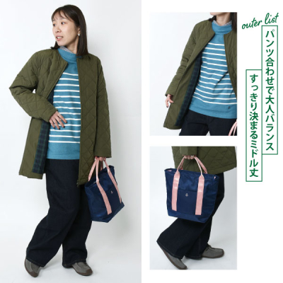 上品かつカジュアルな中綿スクエアキルトのノーカラーコート。