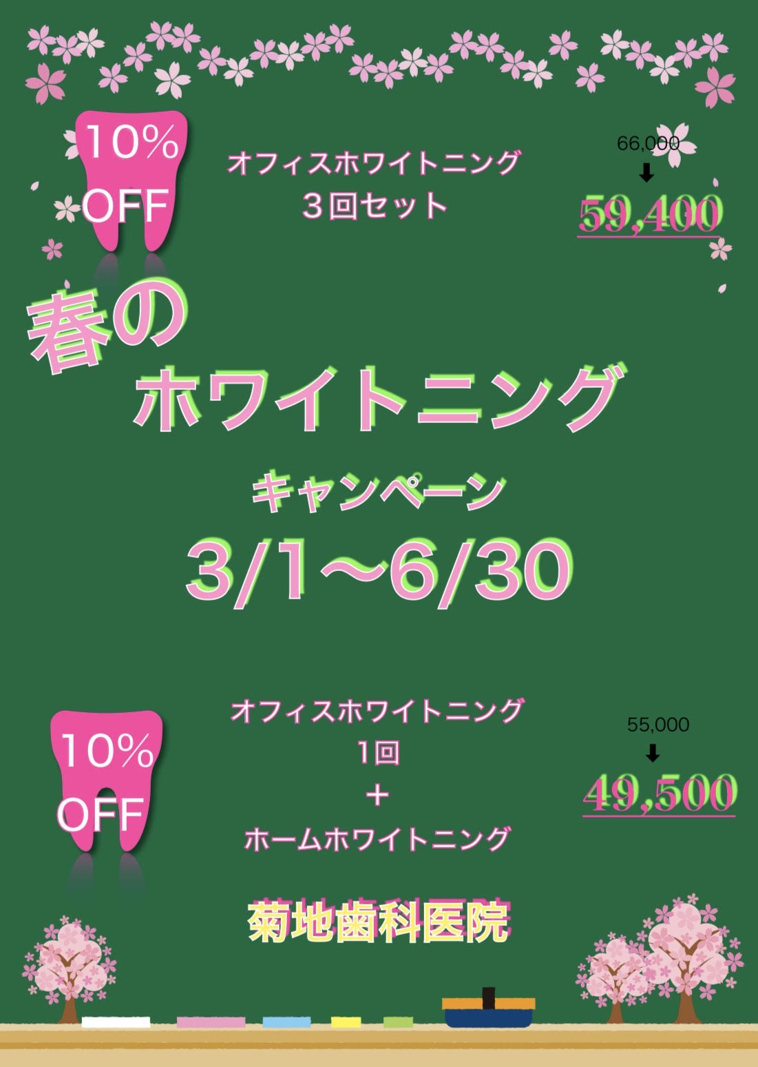 更新日:2026.03.10 菊地歯科医院 03-3734-1055 ホワイトニングキャンペーン 実施日時 3/1~6/30 ~ホワイトニングキャンペーン実施中~ ①オフィスホワイトニング3回セット10%オフ ②オフィスホワイトニング+ホームホワイトニング10%オフ ご予約はお電話での受付のみとなっております。 X この店舗のショップニュース 4月以降の日曜診療日について