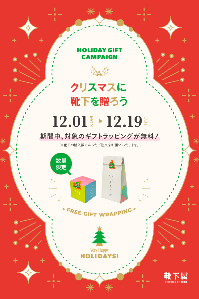 NEW 更新日:2025.12.04 靴下屋 03-6424-5275 今だけ無料!ギフトラッピング 今年もあっという間に12月 クリスマスや 年末年始の帰省などで 贈り物が増える季節です 贈り物って あげるのも貰うのも ドキドキ わくわくしますよね 靴下屋では、 12月19日(金)までの期間限定で 対象のギフトラッピングが無料になります 個数制限は無いので 複数のラッピングでも大丈夫 「1足ずつラッピングしたい」 「中身がわかるように印を付けたい」 など何でもお伝えください 皆さまのご来店をお待ちしております ご注意ください ・ラッピングの袋、箱だけのご購入はできません その場でラッピングをご希望の方が無料の対象です ・ラッピング1つにつき、ショッピングバックを1枚お渡しします おまとめ用の袋が必要な場合は別途ご購入ください X この店舗のショップニュース 現在、該当する情報はありません。