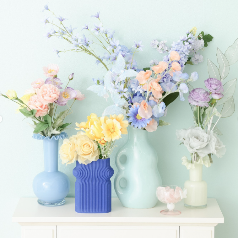 ホワイトやパステルカラーのフラワーベースと合わせたコーディネートもおすすめ。