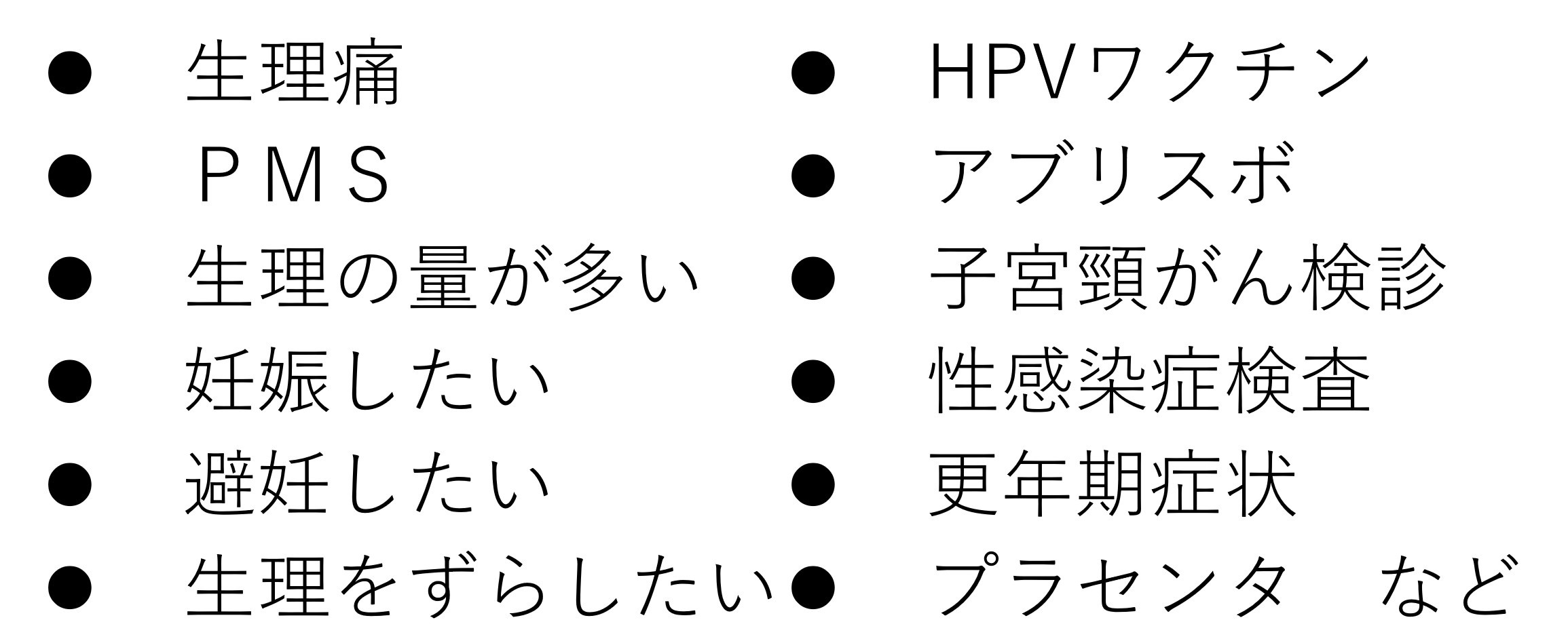 つらい症状があっても、婦人科はちょっと…と受診をためらいがち。つらいまま我慢しているのはもったいないので、とにかく気軽に相談できる、何歳でも行ける、また行きたくなるレディースクリニックを目指して開院しました。生理痛、PMS、妊娠希望、性感染症、避妊、生理をずらしたい、更年期症状など、どんな症状でも、おひとりで悩まず、気軽にご相談下さい。院長の稲葉可奈子(産婦人科専門医)がおひとりおひとりにあった診療を行います。小中学生からあらゆる年代の方がご受診頂けます。かかりつけの産婦人科をもつことで女性はもっと快適になります。なにか気になることがありましたらぜひお気軽にご受診下さい。