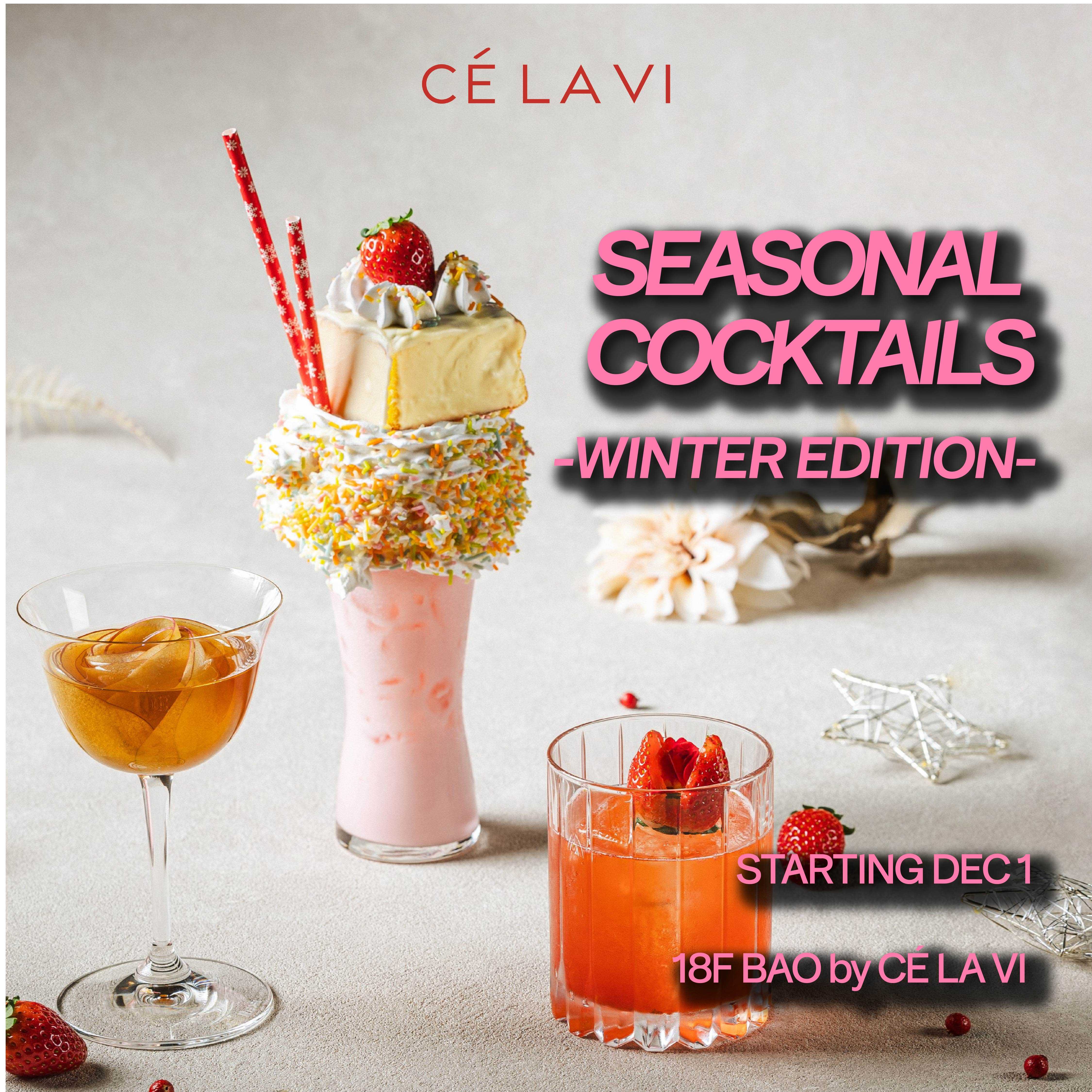 NEW 更新日:2025.12.03 BAO by CÉ LA VI 0800-111-3065 12/1(月)より、味わいと華やかさが織りなす冬のシーズナルカクテルが登場! BAO by CÉ LA VIにて、冬のシーズナルカクテルが登場!✨ りんごの香りがふわっと広がり、花が開くように変化する一杯。 甘酸っぱさが軽やかに弾けるベリーのフレーバー。 ショートケーキの遊び心をそのまま閉じ込めた、デザート感覚の一杯。 味わいと華やかさが織りなす、冬限定のドラマティックなカクテル体験を❄️ ROSÉ APPLE ローズアップル ¥2,100 AMARETTO BERRY アマレットベリー ¥2,000 SWEETBOMB POP スイートボム ポップ ¥3,500 ★ご予約はこちらから X この店舗のショップニュース CÉ LA VI TOKYO 6th Anniversary -REVIVAL MENUが期間限定で登場! 11月17日(月)より、忘新年会にぴったりの新プランが登場! 11月17日(月)より、冬の楽しみが広がるHOT POTが登場!