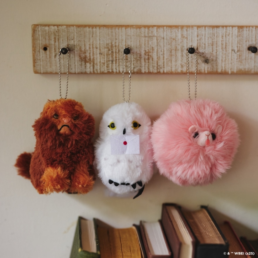 ふわふわとした触り心地のヘドウィグ、クルックシャンクス、ピグミーパフのぬいぐるみチャーム。