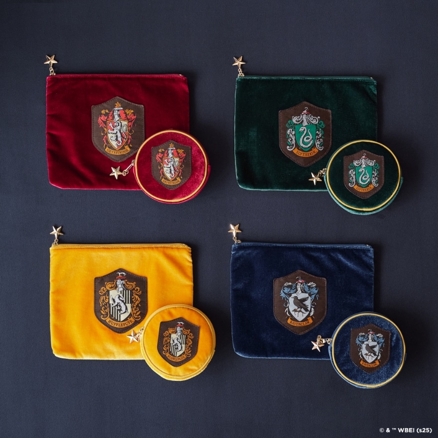 グリフィンドール、ハッフルパフ、レイブンクロー、スリザリンの寮章をワッペンであしらったポーチ。