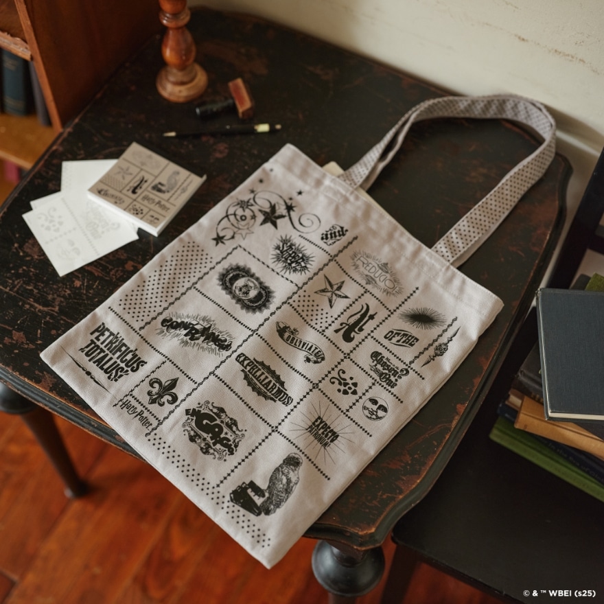 さまざまな呪文やアイコンをデザインしたトートバッグ。